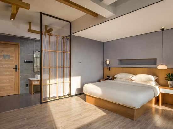 酒店简介 桂林HAO酒店位于象山区中山南路(南溪山公园旁),距离城徽象鼻山公园约一公里,交通便利;紧临南溪山公园和龙船坪码头,通往市区各大景区约15分钟车程。桂林HAO酒店是家佰业旗下高端连锁品牌酒店,以精炼服务+local文化为核心特色,秉承“给你更好、始终如一”的服务理念,打造城市度假生活体验酒店拥有设施齐备的客房、现代时尚的餐厅和完善的配套设施,可全面满足休闲、度假和商务旅行者的各种需求,是客人优选的居停之所,更是一个充满活力和都市风格的社交场地。在这里,您既可以享受商务的便捷,又可以享受充满欢乐、惊喜与浪漫的假期。MODERNZEN都市新禅意设计风格,匠心设计,简约不失内涵,落地成风景。首创空中会所级大堂,书吧、餐吧、休闲吧相融交汇于此,是您和朋友欢聚的好去处。一茶一物一床,一灯一饰一椅,贴心的客房设施,让您尽情放松,焕发活力,感受桂林山水之美。桂林HAO酒店位于象山区中山南路(南溪山公园旁),距离城徽象鼻山公园约一公里,交通便利;紧临南溪山公园和龙船坪码头,通往市区各大景区约15分钟车程。桂林HAO酒店是家佰业旗下高端连锁品牌酒店,以精炼服务+local文化为核心特色,秉承“给你更好、始终如一”的服务理念,打造城市度假生活体验酒店拥有设施齐备的客房、现代时尚的餐厅和完善的配套设施,可全面满足休闲、度假和商务旅行者的各种需求,是客人优选的居停之所,更是一个充满活力和都市风格的社交场地。在这里,您既可以享受商务的便捷,又可以享受充满欢乐、惊喜与浪漫的假期。MODERNZEN都市新禅意设计风格,匠心设计,简约不失内涵,落地成风景。首创空中会所级大堂,书吧、餐吧、休闲吧相融交汇于此,是您和朋友欢聚的好去处。一茶一物一床,一灯一饰一椅,贴心的客房设施,让您尽情放松,焕发活力,感受桂林山水之美。